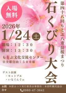 開催日:2026年1月24日 石くびり大会 開催日:2026年2月14日 第24回もとぶ観光文化フェスタ 伝統芸能祭 開催日:2026年1月17日 第48回もとぶ八重岳桜まつり(2月8日まで期間を延長します。) 開催日:2025年12月12日 渡久地港海上イルミ点灯式Xmasイベント2025 開催日:2025年11月22日 第2回もとぶの食と文化フェスタ 開催日:2025年11月2日 MOTOBU GENKI MATSURI 開催日:2025年10月12日 第23回もとぶ観光文化フェスタ 開催日:2025年9月7日 旬のごちそう縁日 開催日:2025年8月16日 第52回本部海洋まつり 開催日:2025年9月21日 現代版組踊 北山の風〜今帰仁城風雲録〜 開催日:2025年7月26日 もとぶの食フェアー 開催日:2025年8月2日 マハイナフェスタ