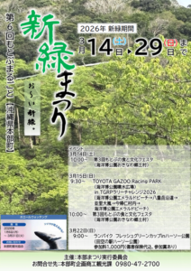 開催日:2026年3月13日 キッズ向け!体験イベント第2回星と天体入門 開催日:2026年3月15日 ラリーチャレンジin沖縄 ラリー体験会 開催日:2026年3月15日 TOYOTA GAZOO Racing Rally Challenge in沖縄 Rd.1 開催日:2026年3月14日 もとぶの食と文化フェスタ もとぶまーさん堂 IN海洋博公園おきなわ郷土村 開催日:2026年3月14日 第6回もとぶまるごと新緑まつり 開催日:2026年1月24日 石くびり大会 開催日:2026年2月14日 第24回もとぶ観光文化フェスタ 伝統芸能祭 開催日:2026年1月17日 第48回もとぶ八重岳桜まつり(2月8日まで期間を延長します。) 開催日:2025年12月12日 渡久地港海上イルミ点灯式Xmasイベント2025 開催日:2025年11月22日 第2回もとぶの食と文化フェスタ 開催日:2025年11月2日 MOTOBU GENKI MATSURI 開催日:2025年10月12日 第23回もとぶ観光文化フェスタ